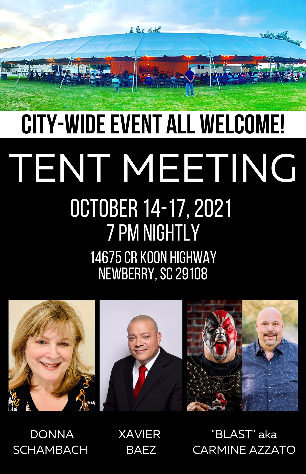 Newberry, South Carolina Thursday, October 14, 2021 7:00 PM 19:00 Sunday, October 17, 2021 8:00 PM 20:00 Schambach Foundation P.O. Box 9009 Tyler, TX 75711 Tyler Texas United States (map) Google Calendar ICS October 14-17, 2021 Newberry, South Carolina TENT MEETING
